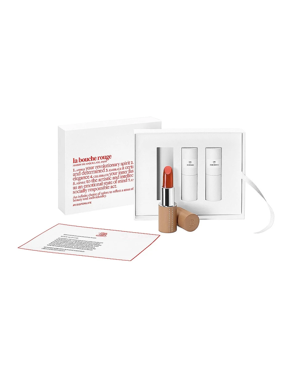 Delight those you cherish most with The Brown Nudes Set. Featuring the brand’s best-selling nude hues, the irresistibly nourishing lipstick refills slip inside the matching fine leather case. La Bouche Rouge pigments are micronized and infused in a vegetable oil to achieve a pure, intense color, an ultra-smooth application, and a flawless fix. Created with Organic Virgin Jojoba Oil, Vegetable Squalane, Shea Butter, Hyaluronic Acid, and Vitamin E, the formula acts as both a lipstick and serum, leaving lips pillow-soft, moisturized and rejuvenated.