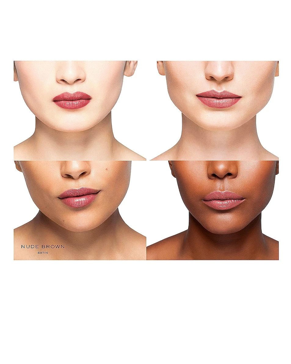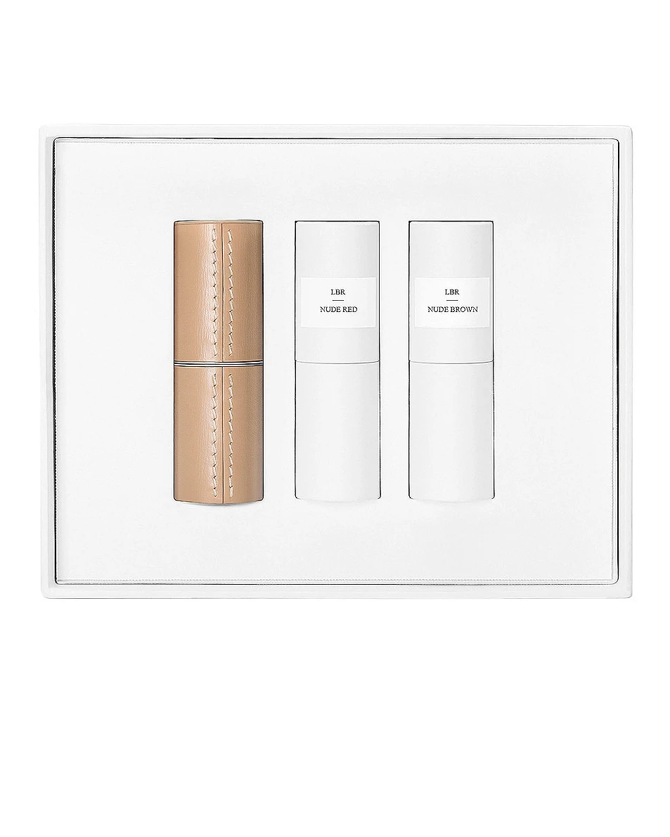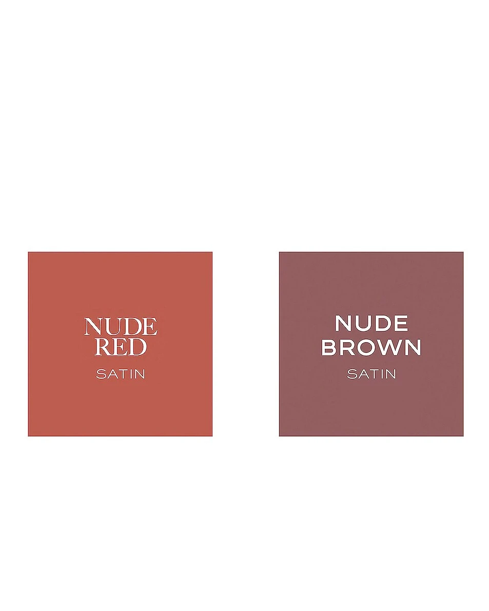 - Includes: Nude Red (satin warm brown), Nude Brown (satin cool blue), Refillable Leather Case in Camel